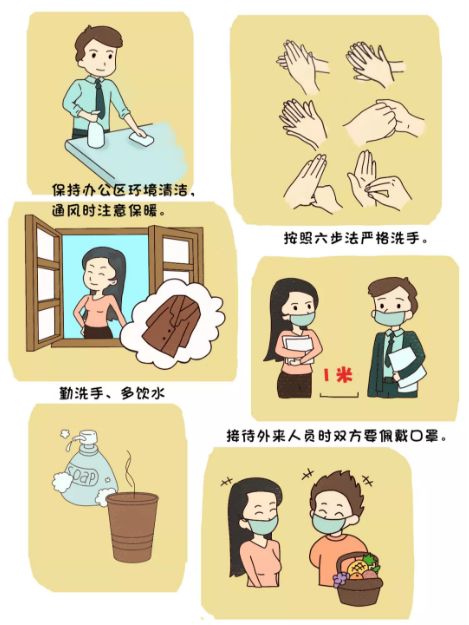 保持辦公區環境清潔,建議每日通風3次,每次20-30分鐘,通風時注意保暖。人與人之間保持1米以上距離,多人辦公時佩戴口罩。保持勤洗手、多飲水,堅持在進食前、如廁后按照六步法嚴格洗手。接待外來人員雙方佩戴口罩。