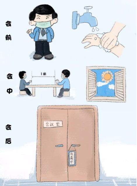 建議佩戴口罩,進入會議室前洗手消毒。開會人員間隔1米以上。減少集中開會,控制會議時間,會議時間過長時,開窗通風1次。會議結束后場地、家具須進行消毒。茶具用品建議開水浸泡消毒。