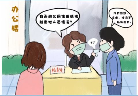 須佩戴口罩。進入辦公樓前首先進行體溫檢測,并介紹有無湖北居住史或接觸當地人員情況,以及有無發熱、咳嗽、呼吸不暢等癥狀。無上述情況,且體溫在37.2°正常條件下,方可入樓公干。