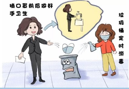 防疫期間,摘口罩前后做好手衛生,廢棄口罩放入垃圾桶內,每天兩次使用75%酒精或含氯消毒劑對垃圾桶進行消毒處理。