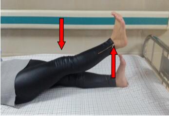 取仰臥位,膝關(guān)節(jié)盡量伸直,大腿前方的股四頭肌收緊,踝關(guān)節(jié)盡量背伸,緩慢抬起整個下肢約15cm,保持5-10秒,再保持同樣姿勢緩慢放下,兩腿交替以上動作。抬高、放下為一次,15次為1組,每天3組。