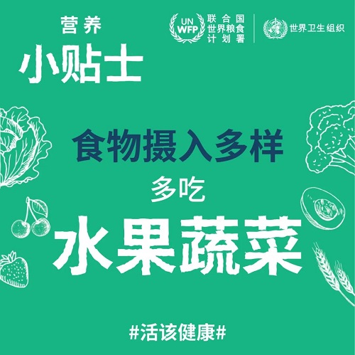 日常飲食中應含有小麥、玉米、大米、土豆等多種主食,外加不同的豆類、大量的新鮮水果和蔬菜以及肉類、魚類、蛋類和奶類食品等動物來源的食品。