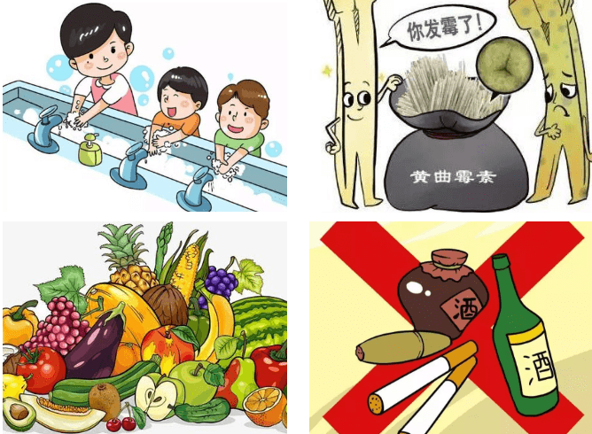 3、注意飲食飲水衛生,不吃霉變食物如發霉花生、玉米、黃豆等、煙熏香腸、臘肉及一些罐裝食品如超市賣的罐裝水果等。