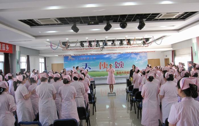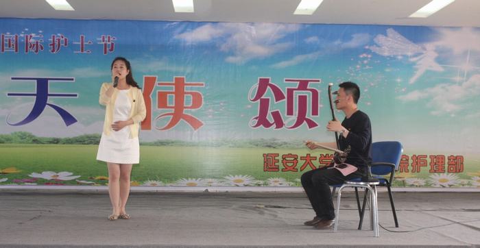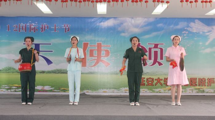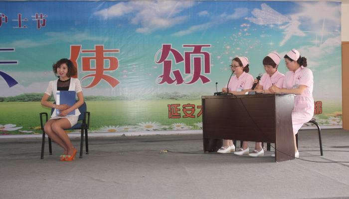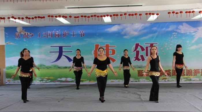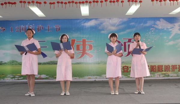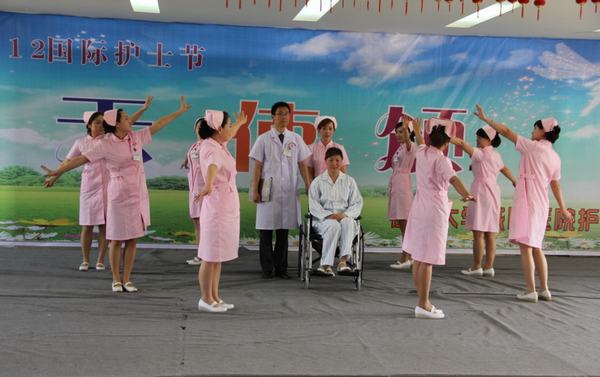 慶祝節目精彩紛呈,心臟系統的表演劇《我是一名護士》,從護士職業禮儀的站、坐、行、蹲、推治療車、持病歷夾等方面進行了護士禮儀展示,在優美的背景音樂襯托下,莊重而優雅,標準而婀娜的禮儀展示,如一場美妙的音樂劇,贏得了觀眾的陣陣掌聲。秦腔表演《十五貫》片段,展示了我們護理人的多才多藝,其哥哥的板胡伴奏更為節目錦上添花。腦血管病系統帶來了舞蹈《印度風情》,病房里,白衣天使展現的是她們輕巧嫻熟的技術,而舞臺上的她們舞姿輕盈優美,臺下掌聲和歡呼聲此起彼伏。隨后在磅礴的音樂伴奏下,四位護士緩緩走上舞臺,此刻的她們美麗、純潔、高貴、神圣,燕尾帽下的張張笑臉為我們譜寫了大愛無疆的《天使頌》。女聲獨唱將《那片海》中執著的情感演繹的淋漓盡致。外科系統精心準備了三句半《護士真善美》,你看,她們敲鑼打鼓、氣勢驕人,卻用簡捷、詼諧的語言,將外科各科職業的辛酸和快樂表達的活靈活現,時而感人至深,時而令人捧腹大笑。內科系統演繹的小品《招聘新時代》,將大會推向了高潮,演員們精神飽滿、配合默契、詼諧幽默,將招聘時的各種狀況表演的惟妙惟肖,贏得觀眾的頻頻尖叫聲和喝彩聲,讓人不禁聯想起了自己當年應聘的情景。外科系統、內科系統的娛樂節目:《快樂傳真》和《蘿卜蹲》更是讓整個會場充滿了開懷的笑聲,成了歡樂的海洋。