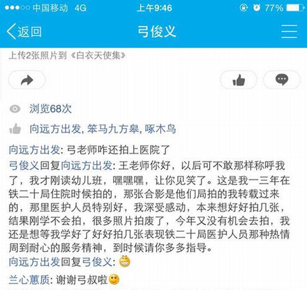 “你們還記得前年在咱科住過的一個叫弓俊義的患者嗎?這些照片都是他拍的!”我忽地就想起來那位個子不高,身材瘦小,臉上掛滿笑容的大叔。記得他住院時和他交談的過程中提過他愛好攝影,只是這些照片是他什么時候拍的?又是怎么到護士長手機上的呢?
