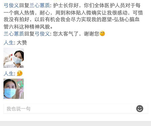 這些照片記錄了我們正給病人扎針時認真的表情、給病人翻身時充滿愛的動作、跟病人交流時真誠的笑容……真是想不到我們在工作時是這么美!我仿佛從照片里看到我們每個人身后都有一雙隱形的翅膀,天使那柔和的光隱隱籠罩在四周。大叔給這組照片起名《白衣天使集》,還在下面說了一段話“延安大學咸陽醫院,在大西北對于心腦血管治療上很有名氣,是獨一無二的??疲貏e是六科給我的印象最深?!笨赐赀@些照片再看到這句話時,我的心里充滿了感動。都說“金杯銀杯不如病人的口碑”,這些照片和這段話是對我們辛勤勞動最大的肯定與鼓勵。護士長小小的一個舉動,為我們與患者之間搭起了一座橋,拉近了我們護患之間的關系,讓我們看到了我們工作的價值所在,也讓患者更加了解我們。
