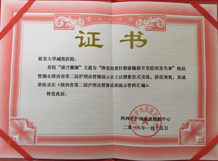 2016年1月14日至15日,由陜西省質(zhì)控中心舉辦的陜西省第二屆護(hù)理品管圈成果展示會(huì)在西安軍區(qū)招待所隆重召開。此次成果展示會(huì)選自全省的124個(gè)圈。大會(huì)有38個(gè)品管圈進(jìn)行展示,其中有18個(gè)品管圈進(jìn)行PPT匯報(bào),20個(gè)品管圈進(jìn)行壁報(bào)展示。我院重癥醫(yī)學(xué)科三病區(qū)康乃馨圈,主題為:降低留置針靜脈輸液并發(fā)癥的發(fā)生率,參加壁報(bào)交流并獲優(yōu)秀獎(jiǎng),成果被錄入《陜西省第二屆護(hù)理品管圈成果展示資料匯編》為我院爭得榮譽(yù)。同時(shí),在陜西省第二屆護(hù)理品管圈成果展示會(huì)上,我院仍是咸陽市唯一進(jìn)入成果展示的醫(yī)院,為咸陽市護(hù)理界再次爭得榮譽(yù)。