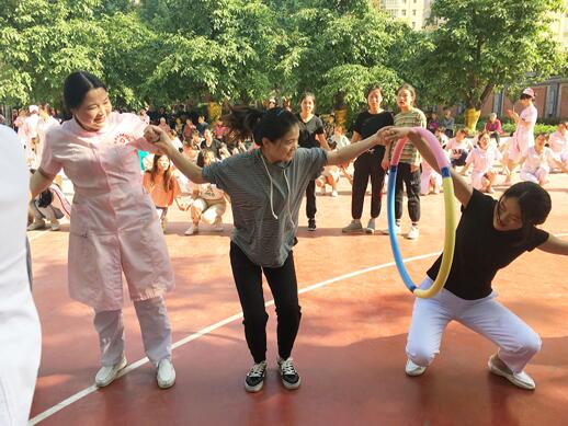 本次團建項目大多為趣味運動,來自各臨床科室的護士及我院駐院護理見習生共一百余人參加。活動分為“團體項目”和個人項目,跳大繩、呼啦圈過山車及摸石頭過河等團體項目首先進行,隨后進行了趣味性較強的個人項目——臀抖乒乓球和瞎子敲鑼。各位選手摩拳擦掌,精神抖擻,躍躍欲試。看這邊“眾志成城,萬眾一心”集體跳大繩比賽,隨著啦啦隊的助威聲,選手們就像雀躍的小鳥一樣歡騰跳躍著;再看那邊“呼啦圈過山車接力比賽” 齊心協力力量大,吶喊聲、加油聲、歡呼聲將現場的氣氛推入了高潮。杏林廣場變成了熱情的海洋,歡笑的中心。白衣天使們一改往日嚴謹、細致、溫柔的形象,在運動場上盡情揮灑汗水,賽出了成績、賽出了風采,你追我趕,盡情享受趣味運動帶來的快樂。
