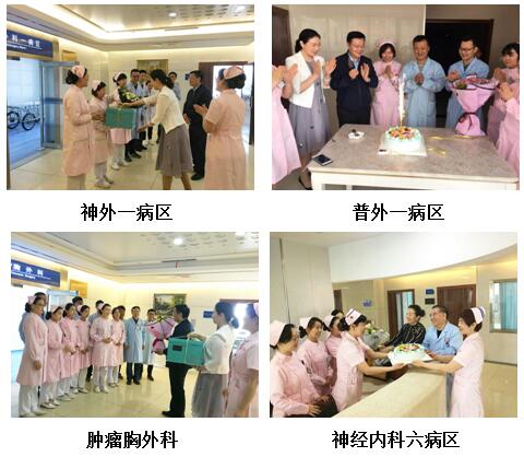 在臨床科室晨交班匯報時、床頭交接班時、工作進行中,延安大學咸陽醫院康彥文院長、張海濤常務副院長、徐京華副院長、工會亓梅主席、科研教學管理中心韓曉芳主任;腦血管病院慕廷民院長、心血管病院吳棟梁院長、內科病院王丙聚院長帶領護理部楊敏主任、陳英總護士長、王長寧總護士長、黨文婷總護士長、宋春蘭總護士長分成四組攜帶精美的大蛋糕、芬芳的鮮花已經意外的出現我院2018-2019年度優質護理服務病區的護理人員面前。