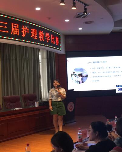 比賽過程中,神經(jīng)內(nèi)科十三病區(qū)高佩佩護(hù)士長從夏日徐徐的涼風(fēng)引發(fā)面神經(jīng)炎切入主題,給大家講述了面神經(jīng)炎發(fā)病機(jī)理及治療原則;“藍(lán)天、白云、雪峰、綠地……”神經(jīng)內(nèi)科十五病區(qū)劉娜護(hù)士長用視覺與想象相對比,告訴大家圖片收集在臨床護(hù)理與護(hù)理科研中的重要性;“造口是開在腹部的一朵玫瑰花”,普通外科二病區(qū)楊圓圓護(hù)士長對造口的專業(yè)護(hù)理,訴說著造口患者的思想顧慮,詮釋了造口護(hù)理的專業(yè)知識。中醫(yī)科董朝妮護(hù)士長根據(jù)事物發(fā)展的動態(tài)規(guī)律,深入淺出的講解了陰陽學(xué)說,陰陽五行、相生相克;簡單的事情重復(fù)做,重復(fù)的事情堅持做,卒中中心李榮榮護(hù)士告訴我們將簡單的事情做精、做專就是偉大;“人命至重,有貴千金”,我們的醫(yī)護(hù)人員在工作中急患者所急,想患者所想,急診醫(yī)學(xué)科樊格護(hù)士為我們帶來了交通傷急救……最后神經(jīng)內(nèi)科二病區(qū)侯漫利護(hù)士為大家?guī)砹艘粓鲇⒄Z授課演示,展示了我院護(hù)理教師隊伍的別樣風(fēng)采。