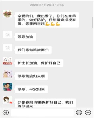面對日漸增多的病例,身為醫(yī)務人員的我們自然責無旁貸。1月23日,科室接到醫(yī)院號召護理人員援鄂抗擊疫情的通知,所有兄弟姐妹們紛紛踴躍報名,得到的都是護士長諸如“你很棒,等待通知”“好,第二梯隊準備”之類的回復,那時候我們懵懂,心底十足的使命感使我們熱血沸騰。之后的三天風平浪靜,沒有接到任何通知,似乎一切都沒有發(fā)生過。直到1月26日,護士長在群里的一段話讓我們炸開了鍋:“親愛的們,我出發(fā)了,你們在家乖乖的,做好防護,仔細排查探視家屬,等我回來”。這時我們才知道,為什么報名后遲遲沒有動靜,在這國家危難時候,護士長她心里只揣著一名護士的職責,她“拋下”了為人子女、為人妻、為人母的責任,把我們擋在后方,而把自己推到了最前線,把直面疫情的重任和未知的危險統(tǒng)統(tǒng)擔在了自己的肩上。
