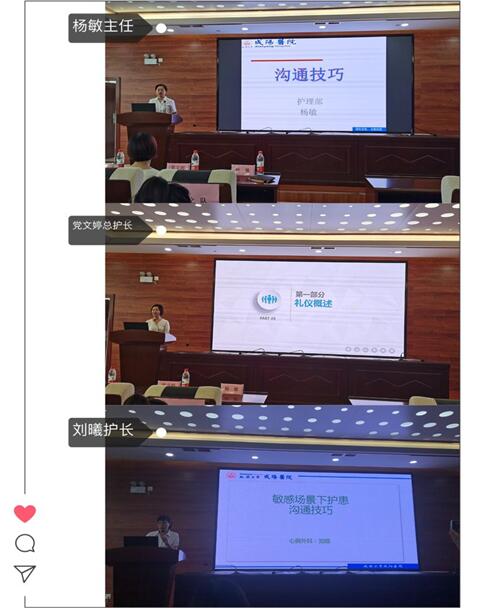 楊敏主任,黨文婷總護士長,劉曦護士長深入淺出的講解了溝通及職業禮儀的重要性,內容新穎、主題鮮明、貫穿的思想深刻而長遠,開拓了護理服務新思維,讓大家感受到了溝通的魅力。