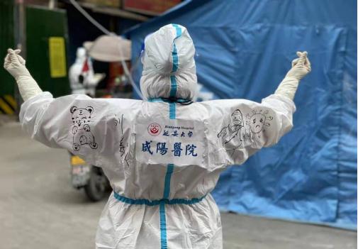 “圣保羅曾說‘這個世界上有三樣?xùn)|西對人類是最重要的——信、望、愛’。我們被稱作白衣天使,向群眾傳遞抗疫必勝的信念,讓她們看到勝利的曙光,感受到醫(yī)務(wù)人員的仁愛之心,這與核酸采集工作同樣重要。因?yàn)椴杉蝿?wù)較重,且有口罩和面屏的遮擋,語言交流不是很順暢,我們便選擇了在防護(hù)服上涂鴉?!辈蓸雨?duì)組長劉曦這樣解釋。