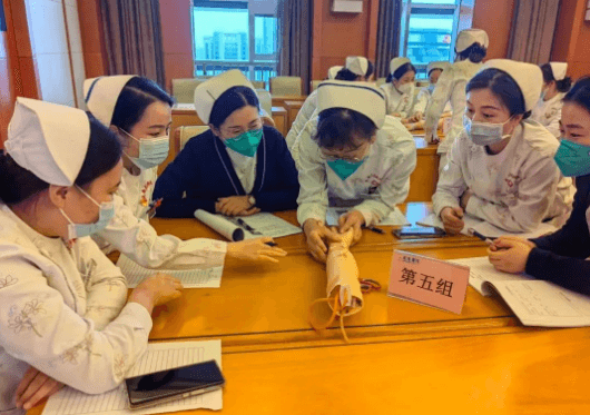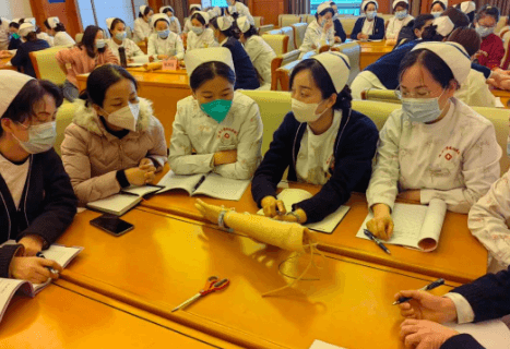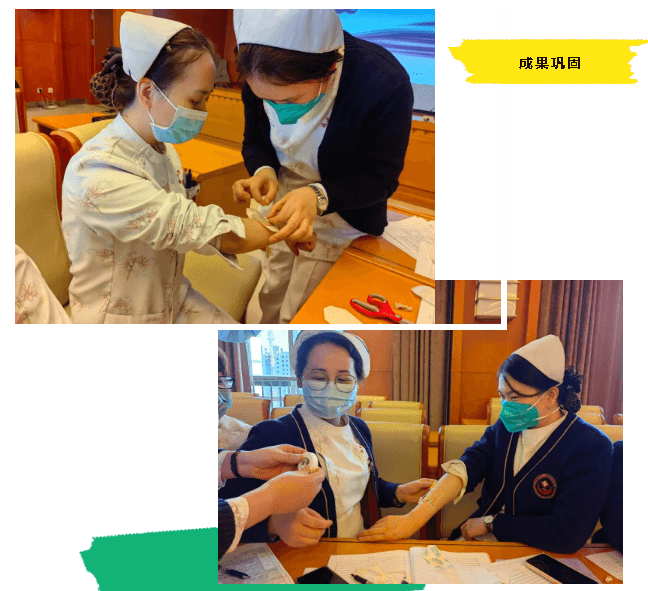 激烈的討論之后,通過一對一、手把手的操作指導,讓參加培訓人員在練習過程中學以致用,更加熟練、準確地踐行留置針規范的固定方法及貼膜撕脫法。