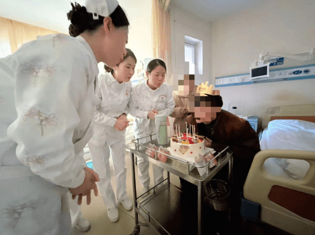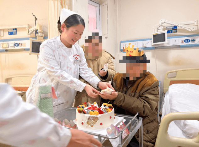 當(dāng)日早晨,醫(yī)務(wù)人員將提前為老壽星準(zhǔn)備好的生日蛋糕和手寫的心愿卡片推到老人面前,并祝愿他福如東海、壽比南山!慶祝過后把蛋糕分發(fā)給病區(qū)的患者,讓大家一起分享這份喜悅,熱鬧的祝壽氛圍、暖暖的生日歌曲、濃濃的關(guān)懷之情,讓整個病區(qū)充滿愛的溫度。