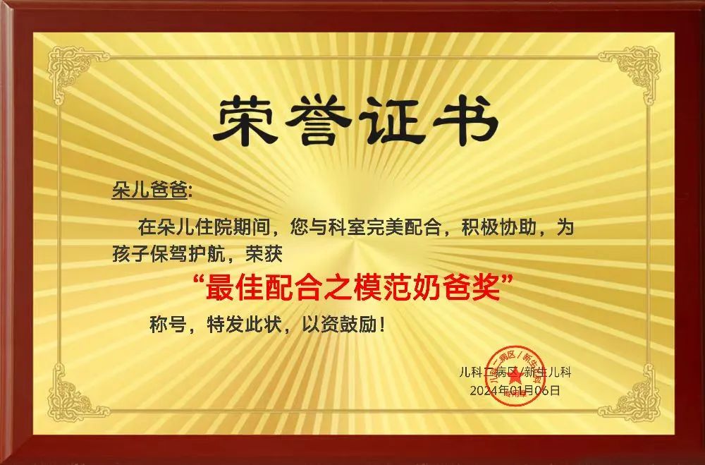 在接下來的幾天,朵爸說話也變得穩重從容了,也不煩躁了,每次見到我都是笑嘻嘻的,住院第七天復查,結果都正常,順利出院,在出院當天我送給朵爸一本“最佳配合之模范奶爸”的獎狀,并讓朵爸掃描家屬微信群,群里每天會發科普視頻和小知識,與眾多家屬共同學習。朵爸開心的像個孩子,點頭說太好啦。所有醫護人員都對朵爸贊許不斷,為朵爸豎起大拇指。一家人都很感激在住院期間遇到了像我這樣特別的護士。