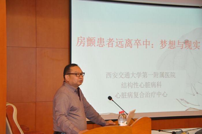 張玉順教授現為西安交通大學醫學院第一附屬醫院心血管病醫院副院長,周圍血管病科主任醫師、博士,中國老年保健醫學研究會心臟學會副主任委員、中國醫藥信息學會心功能學會副主任委員,亞太心臟聯盟結構性心臟病分會副主任委員兼秘書長,結構性心臟病工作委員會副主任委員等,在結構性心臟病的介入治療、暈厥、偏頭痛、不明原因腦卒中等心腦血管疾病及肺動脈高壓等的研究方面處于世界領先水平。張教授以《讓房顫患者遠離卒中》為題,旁征博引、圖文并茂,向與會者闡述了如何提高心血管病診療能力的方法,通過大量的臨床實例進行深入分析,使醫務人員對如何提高臨床能力有了較為全面的認識和了解,為我院心血管病院的臨床工作指明了發展的方向。張教授通俗易懂、生動有趣的授課,引起了大家的共鳴,贏得了現場陣陣熱烈的掌聲。