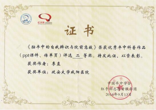 近日,從中國卒中學會紅手環志愿者服務團傳來喜訊,我院腦血管病院在中國卒中學會優秀卒中科普作品征集活動中表現出色,由神經內科貴賓病區李直醫師創作的《腦卒中的自我辨識與院前急救》和《卒中的誘因與預防》分別榮獲優秀卒中科普作品評選二等獎!