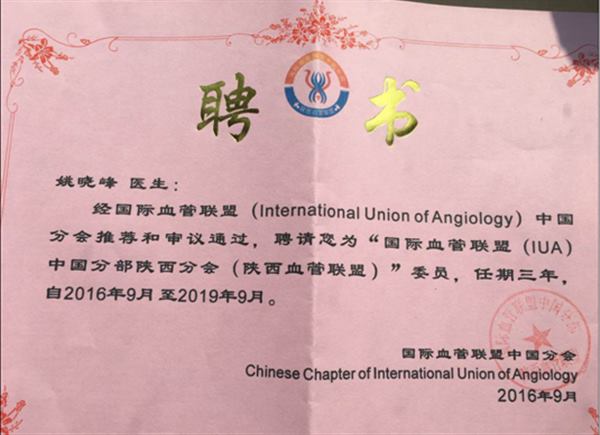 熱烈祝賀我院姚曉峰副院長當選為國際血管聯盟中國分部陜西分會委員