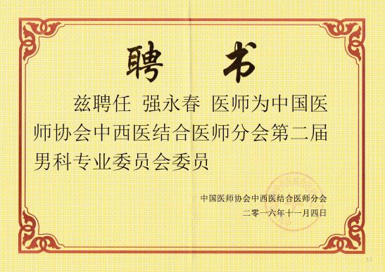 近日,從中國醫師協會中西醫結合醫師分會獲悉,我院泌尿外科強永春主任被聘為中國醫師協會中西醫結合醫師分會第二屆男科專業委員會委員。