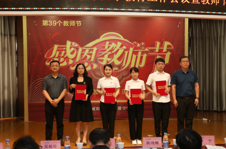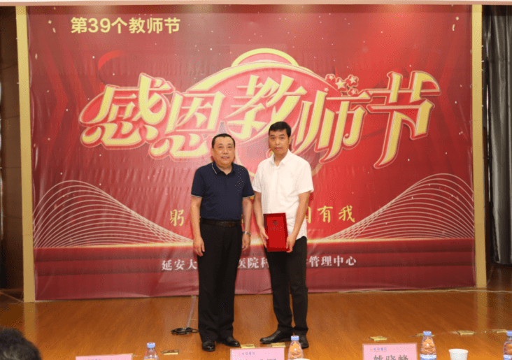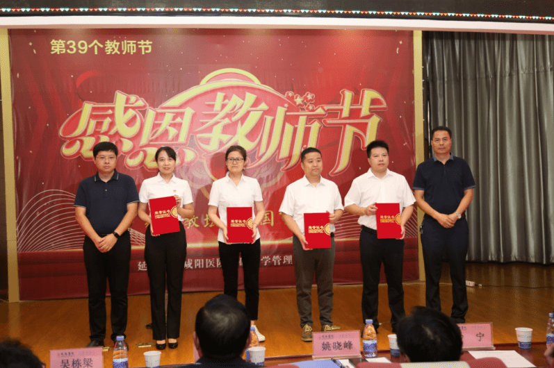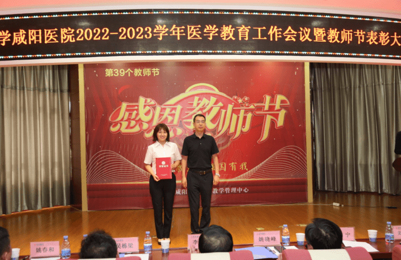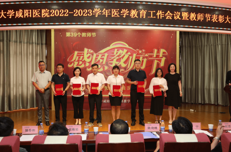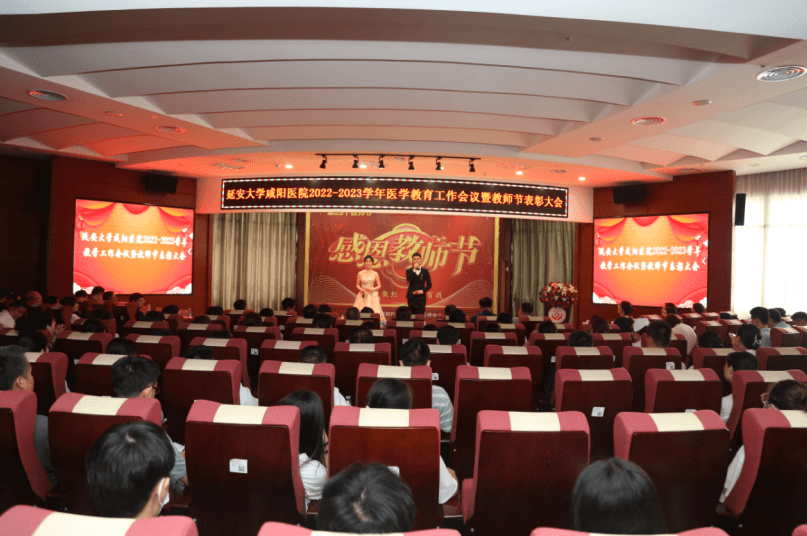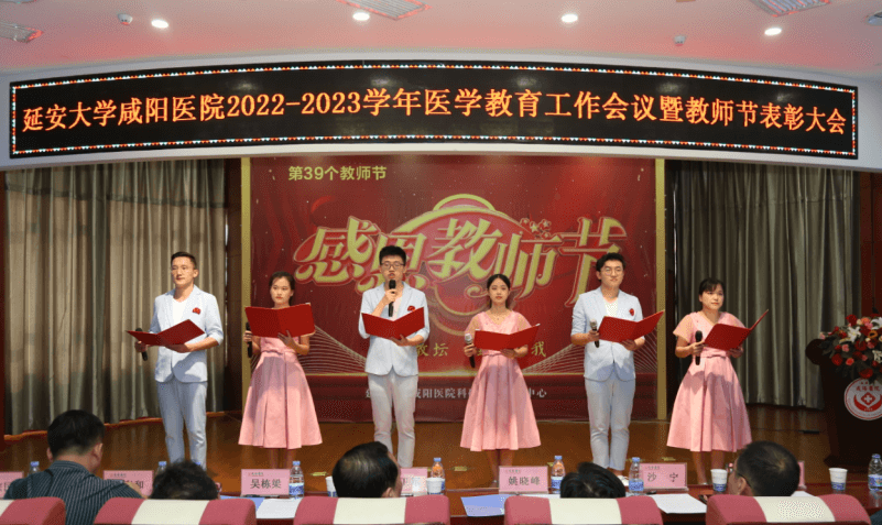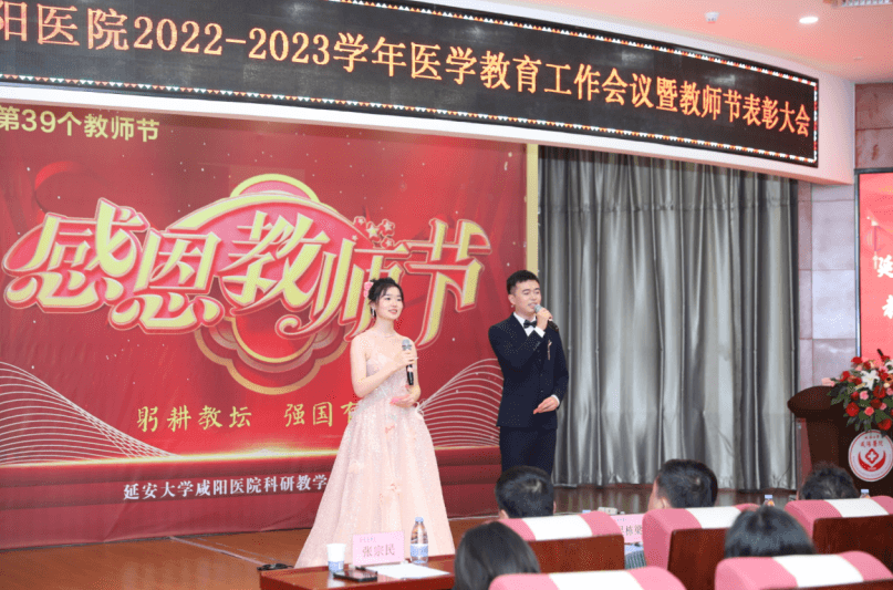 為熱烈慶祝第39個教師節,2023年9月8日下午,我院在腦血管病院第三學術廳隆重舉行了 “2022-2023學年醫學教育工作會議暨教師節表彰大會”。精誠醫療管理集團主席李衛軍、延安大學咸陽醫院院長姚曉峰、常務副院長吳棟梁、行政副院長兼工會主席沙寧、外科病院副院長姚春和、院長助理劉連鋒、院長助理張宗民、劉貝磊副總會計師、院長助理巨濤、內科病院副院長張玉河、科研教學管理中心副主任陳青、調研員韓曉芳、口腔病院副院長韋彥鋒、精神心理病院副院長胡曉科、各職能部門負責人、臨床帶教老師、住培醫師(含專碩研究生)、實習生代表等共200余人進行現場觀看,本次會議由延安大學實習生安磊、武樂樂主持。