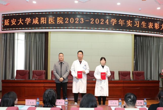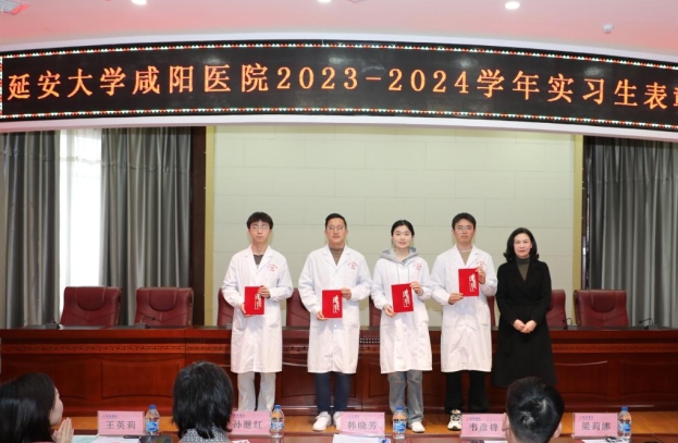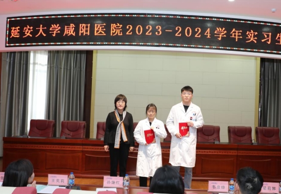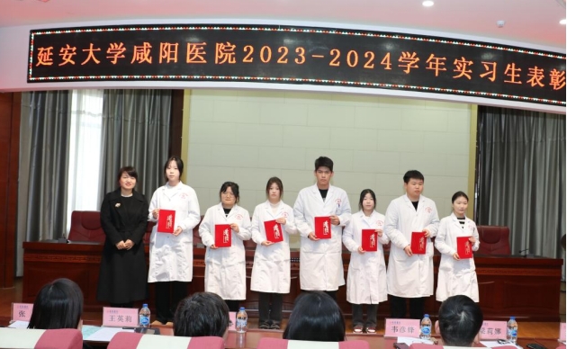 延安大學咸陽醫院韓曉芳調研員宣讀了《延安大學咸陽醫院科研教學管理中心關于表彰2023-2024學年優秀實習生的通知》,她希望受表彰的同學珍惜榮譽、戒驕戒躁、發揚成績、再接再厲,始終保持昂揚的斗志,更好地發揮示范引領作用,其他實習生要以先進為榜樣,勤奮務實、刻苦鉆研、銳意進取、開拓創新。隨后,進行實習生表彰。