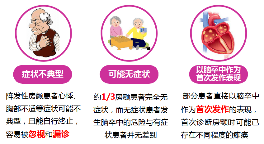 房顫癥狀可能不典型,1/3患者完全無癥狀,部分患者直接以腦卒中作為首次發作的表現,腦卒中是房顫最嚴重的危害,致殘、致死率高。