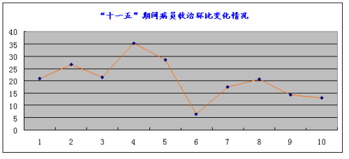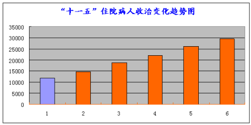 說明:“十一五”末較“十五”末住院病人收治增加1.51倍;年平均增長速度為30.19%;日均在院病人“十一五”末為937人,較“十五”末平加了1.29倍;完成了醫院規模經營階段性目標。