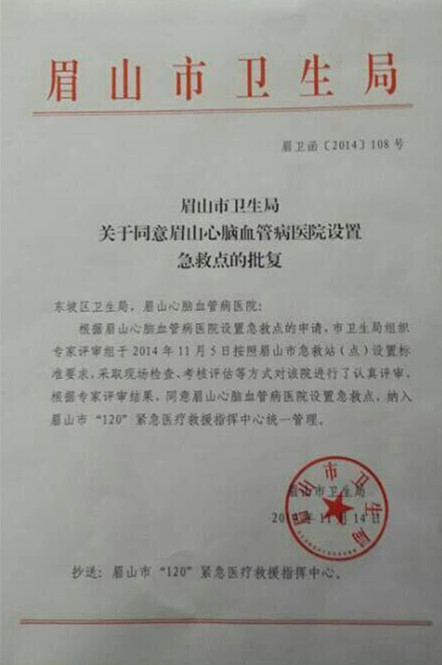 根據(jù)專(zhuān)家評(píng)審結(jié)果,同意眉山心腦血管病醫(yī)院設(shè)置急救站點(diǎn),納入眉山市“120”緊急醫(yī)療救援指揮中心統(tǒng)一管理。