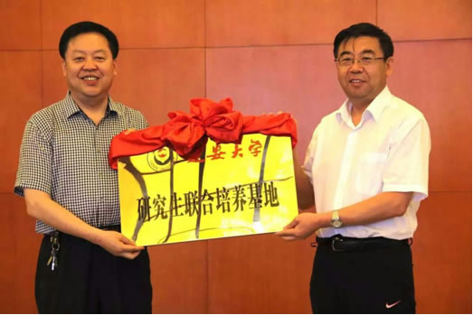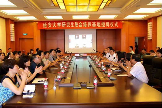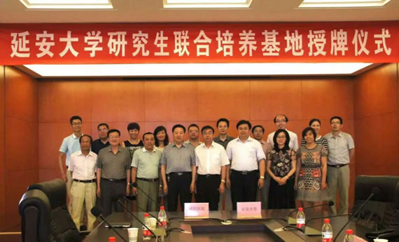我院科研教學管理中心副主任韓曉芳與延安大學醫學院院長韓繼明簽訂研究生培養基地協議;延安大學馬勇副校長為張群董事長頒發延安大學碩士研究生教育指導委員會委員聘書。
