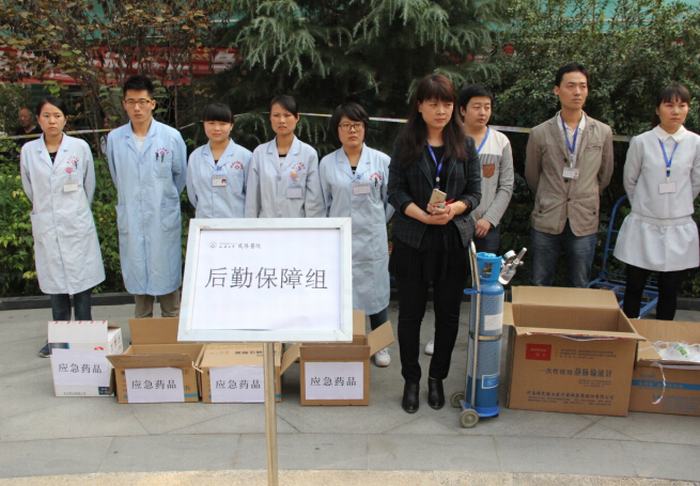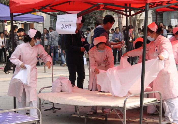 14點40分,各樓各科室全部安全撤離至指定安全臨時避震區域,各科室護士長迅速清點科室人數,并報告通訊聯絡組,通訊聯絡組匯總整體傷亡和損失情況后向總指揮作了簡要匯報。總指揮命令,“各應急搶險小組在醫技樓北面噴泉廣場迅速集合!”14:42各急救小組人員迅速在醫技樓北面噴泉廣場集結完畢,各組長向總指揮報告,待命。總指揮視察大樓情況,暫無嚴重毀壞和倒塌跡象,宣布啟動地震應急預案,發布抗震搶險命令,開始抗震救災。隨后,總指揮命令搶險疏散組、通訊聯絡組在外科樓外圍向樓內喊話,尋找其他被困人員;指示后勤保障組緊急建立醫療區域,搭建了四頂臨時帳篷作為指揮所和搶救室,架設220V供電線路提供照明,劃設急救區、治療區和警戒區;指導醫療救護組救治震中受傷人員。救治中進行了顱腦損傷、右脛骨骨折等病情的緊急救治。