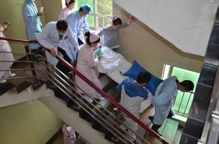 14點35分預警過后,晃動停止。總指揮判斷現場情況,在樓房沒有明顯破壞的情況下,發出緊急疏散命令,隨后,總指揮和導演組撤離至醫技樓北面噴泉廣場,成立臨時總指揮部。科室主任、護士長立即指導科室人員立即打開所有通道,組織人員緊急處理各種病情的危重癥患者,將患者在擔架上固定好,并按疏散演練預定路線有序撤離到樓外花園臨時集合地。在疏散中各科室人員臨危不亂,始終以患者的安危為先。通訊聯絡組安排人員在各樓層樓梯間指導人員有序撤離,并監察各科室演練實施情況。急診醫學科護士長不顧自己的安危保護在地震中正在搶救的病人,核醫學科醫生冒著被輻射的生命危險將一名正在檢查的行動不便患者攙扶到安全區域,神經內科三病區、重癥醫學科等其他科室也妥善處理演練中安排的特殊患者。