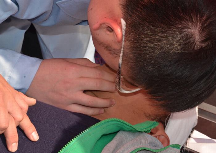 14點45分,通訊聯絡組向總指揮匯報在急診醫學科醫生辦公室出現局部坍塌,造成2人受傷被困;醫技樓二樓樓梯間堵塞,病理科人員無法撤離,需要排險。總指揮當即指示搶險疏散組攜帶鏟式擔架、氧氣包、撬棍、鐵鍬、應急照明燈沖進樓內搶救被困傷員,經過15分鐘的緊張營救,2名被困的急診醫學科的醫務人員脫離危險區域。地震時2名人員受傷,系顱腦損傷、右脛骨開放骨折,顱腦損傷傷員到達噴泉廣場后出現呼吸心臟驟停,醫療救護組組長沈建華副院長立即指導醫務人對傷員進行緊急救治,救治中使用了心肺復蘇、包扎、外固定、輸液、測量血壓、氧氣包吸氧等技術操作。之后地震演練繼續有序進行。