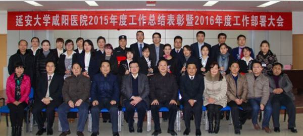 2016年1月22日下午延安大學咸陽醫院在綜合樓四樓會議室舉行“延安大學咸陽醫院2015年度工作總結表彰暨2016年工作部署大會”,董事長張群、黨委書記李衛軍、院長康彥文、常務副院長張海濤等院領導,各部科室主任、護士長及部分職工,共計400余人參加了會議。