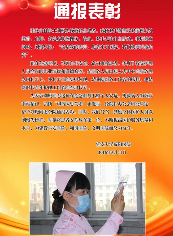 事情發生后,院領導高度重視,多次前往劉熳住處看望,并囑托她安心養傷。為表彰劉熳同志這種在危急時刻不顧個人安危,勇救病人的敬業奉獻精神,弘揚“和諧醫患關系”正能量,經院長辦公會研究決定,給予劉熳同志”優秀護士”稱號并全院通報表彰。同時,我們號召、鼓勵全體醫護人員以劉熳為榜樣,時刻將患者安危放在第一位,不斷提高醫護服務質量和水平,為建設平安醫院、和諧醫院、文明醫院而努力奮斗。