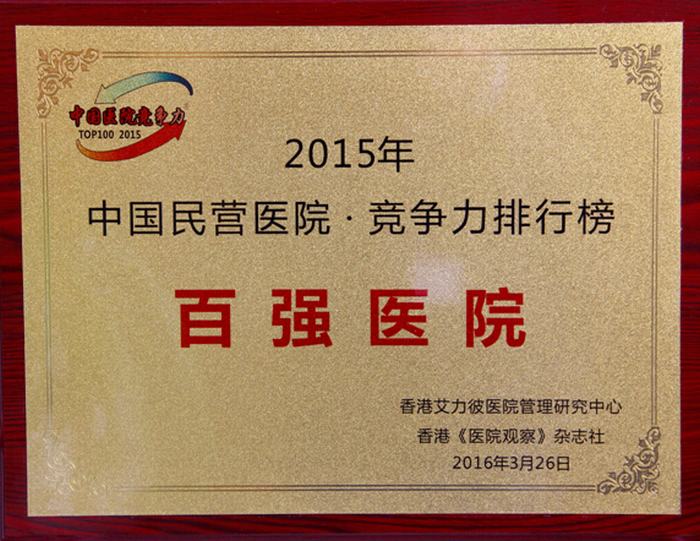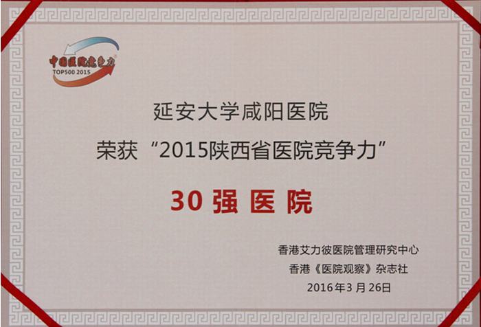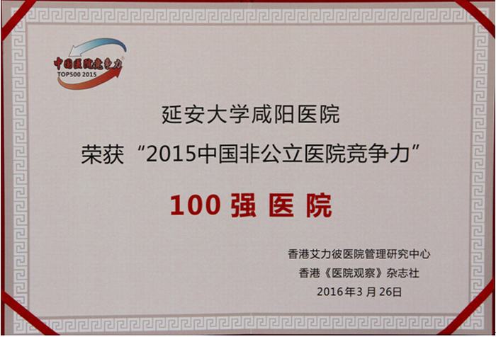 2016年3月26日,香港艾力彼醫院管理研究中心發布了“2015中國非公立醫院競爭力”100強醫院,我院位列榜單第21名。同時發布了“2015年省域醫院30強榜單”,我院位列陜西省醫院30強榜單第27名。