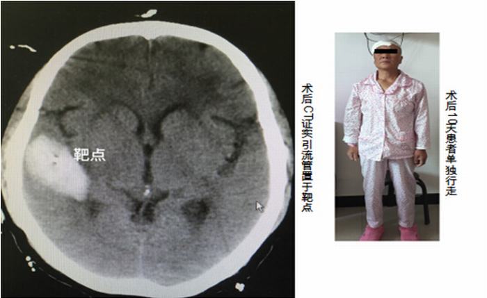 2016年4月21日凌晨2點,閆女士突然出現(xiàn)頭痛、左側肢體無力等癥狀,當晚即被家人緊急送醫(yī),經(jīng)查,她大腦的右側顳葉出現(xiàn)腦出血。經(jīng)過細致的準備,我院神經(jīng)外科醫(yī)護人員為閆女士實施了腦立體定向手術,術前安裝頭架,頭顱CT掃描,設定靶點并計算坐標,術中安裝弓形架等,將引流管精確植入靶點---血腫正中心,順利抽出血腫,術后CT驗證立體定向手術精確。現(xiàn)經(jīng)治療10多天后患者已獨立下床活動,恢復理想。