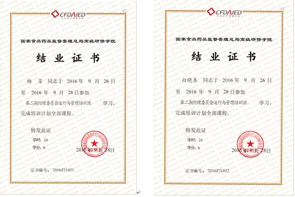 2016年9月26日-9月28日,由國家食品藥品監(jiān)督管理總局高級研修學(xué)院組織舉辦的“第二屆倫理委員會運(yùn)行與管理培訓(xùn)班”在古都西安隆重召開。我院醫(yī)學(xué)倫理委員會委員、制劑室楊芳同志、科教部干事白曉東同志應(yīng)邀參加了此次培訓(xùn)班,并按培訓(xùn)計劃順利完成全部課程的學(xué)習(xí),最終通過考核取得結(jié)業(yè)證書。