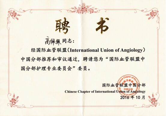 ——熱烈祝賀我院高佩佩護士長獲聘為國際血管聯盟中國分部護理專業委員會委員