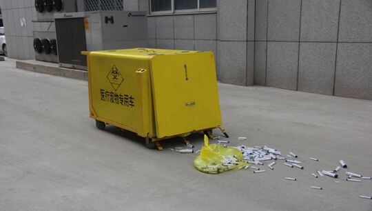 圖2:醫療廢物運送過程中,轉運工具側門關閉不嚴致醫療廢物散落、暴露