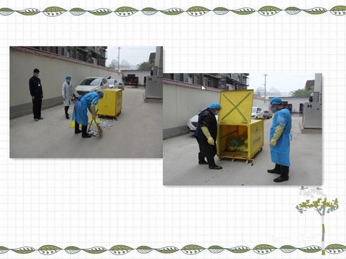 為增強保潔人員對醫院醫療廢物流失、泄露、擴散事件的應急處置能力,檢驗我院應對醫療廢物流失、泄露、擴散等事件時的應急隊伍行動能力、設備設施、消毒防護用品等方面的準備情況,通過演練發現不足及時調整補充,做好應急準備工作。演練模擬醫療廢物轉運人員在運送途中,由于轉運工具側門關閉不嚴,致醫療廢物散落、暴露。醫院感染控制辦公室、保障部在接到事件報告后快速趕到現場,進行危險評估,確定意外事故的風險程度,及時向總指揮報告。同時設立隔離區,禁止行人及車輛穿過,避免污染物擴散,對人員造成傷害。其后,醫院各部門協調配合,進行應急處理。