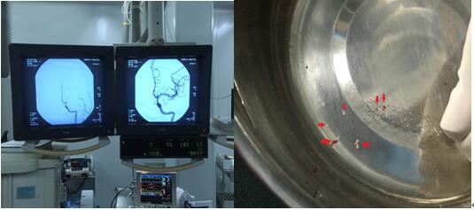 為了讓患者得到更有效、更安全的治療,在與患者家屬溝通后決定急診行全腦血管造影術+機械取栓術??滩蝗菥徎颊弑坏谝粫r間送入導管室,迅速完成了DSA血管造影,證實左側大腦中動脈M1段起始閉塞, 在神經外科知名教授專家姚曉峰副院長帶領下,王偉偉副主任和宋波主治醫師協助下成功完成手術,取出栓子,復查造影顯示閉塞大腦中動脈完全開通,患者意識及右側肢體活動明顯好轉,此時,距患者發病不到5個小時。