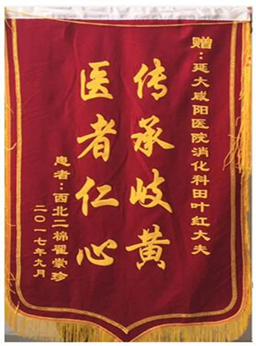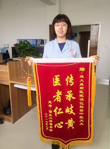 2017年9月29日,延安大學咸陽醫院消化內科迎來了一位大約70多歲滿臉笑容的老者。老者信步走入消化內科醫生辦公室,“我是來表示感謝的”說著他展開錦旗,紅色的背景下映著“醫者仁心,傳承岐黃”八個大字。