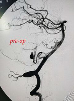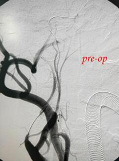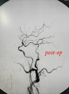 患者一:患者因頸內動脈慢性閉塞(CTO)并伴有進行神經性功能缺損癥狀入住我院神經外科,經腦血管造影及其他充分的影像學資料及術前仔細評估,充分向患者家人告知病情,并經患者家人知情同意在全身麻醉下行右側頸內動脈閉塞血管再通支架植入術,手術過程順利,圍手術期患者病情平穩,術后患者神經功能缺損癥狀明顯緩解,充分展示了我院在缺血性腦血管病方面的造詣。