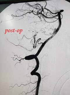 患者二:患者以“蛛網膜下腔出血”入院的病人,患者意識障礙嚴重,急診行腦血管造影術:小腦后下動脈遠端動脈瘤,經姚曉峰副院長仔細研究分析及閱片,制定手術方案,向患者家人充分告知病情危重,隨時有生命危險,患者家人經商議后決定同意手術,急診全麻行動脈瘤介入栓塞術,手術順利,圍手術期平穩,術后患者意識障礙明顯好轉。