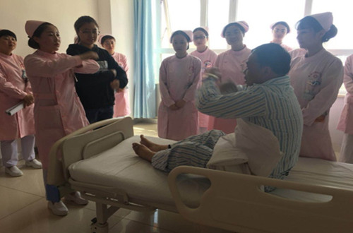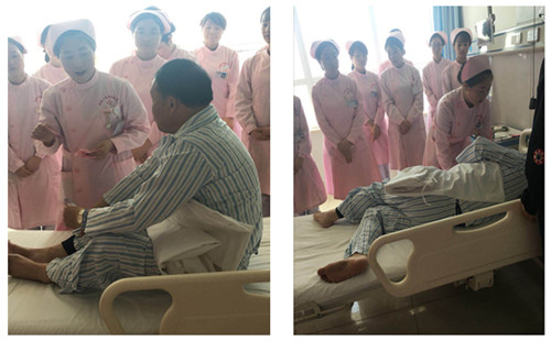 接下來在病房責任護士巨瑤對患者進行了規(guī)范的護理查體,并指導患者及家屬分別進行了語言康復訓練、吞咽康復訓練、肢體功能訓練以及良肢位的擺放。護士專業(yè)的手法、細心地講解贏得了患者、家屬以及現(xiàn)場護理人員的一致好評。康復指導結(jié)束,神經(jīng)內(nèi)科八病區(qū)全體護士針對早期康復相關(guān)專業(yè)知識以及腦卒中患者的心理護理展開了激烈的討論。