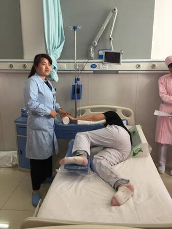 良肢位又稱抗痙攣體位,是指患者在臥位或坐位時軀干及四肢所處的良好體位,是從治療護理的角度出發而設計的一種臨時性體位。梁麗娜主任分別從肢體異常姿勢的產生原理、良肢位的重要性、良肢位早期介入的意義、良肢位所需的輔助用具(踝墊、R型墊、體位護理墊、釘子鞋等)進行了相關知識的普及。隨后重點就仰臥位、健側臥位、患側臥位的良肢位如何擺放進行了詳細的實際模擬教學。