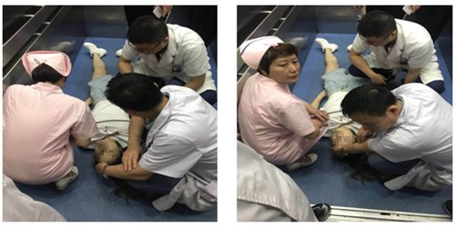 我剛從電梯出來聽到一陣急促的聲音。循聲走去,只見一名白衣女子平躺在對(duì)面的電梯里。她面色蒼白,雙眼緊閉,意識(shí)喪失。骨一科楊志奎主任正跪著掐白衣女子的人中,醫(yī)生曹熙蹲在女子左邊,呼叫著“你醒醒,你醒醒,你怎么了?”,護(hù)士長鄭梅跪在女子右邊,一邊為患者測(cè)血壓,一邊詢問其家屬女子暈厥前的情況。