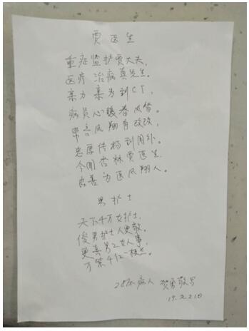 “重癥監護賈醫生,醫療治病真先生。親力親為到CT,……天下千萬女護士,俊男護士人更敬”?;颊咭痪浜唵蔚恼J可,彼此之間卻吹過一股股溫暖的春風,沁人心脾!