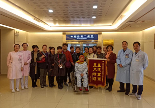 一個月前,薛女士突發(fā)左側(cè)基底節(jié)區(qū)腦出血,量約43毫升,患者呈淺昏迷狀,混合型失語,查體欠合作,智能不合作,劉主任及主管醫(yī)生王海波即行全麻下腦內(nèi)血腫清除術(shù)、顱骨切除減壓術(shù)。經(jīng)過短短一個月的康復(fù)治療和精心護(hù)理,患者從入院時的意識障礙、絕對臥床到現(xiàn)在的神志清楚,簡單問答,緩慢行走。醫(yī)生護(hù)士付出的心血換來患者重新走上了健康之路。這就是最完滿的結(jié)果。
